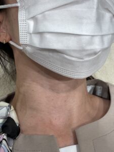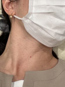 首の真ん中に真っ赤なチェリースポットがあります。よく見ると首の右側にももう1個あります。